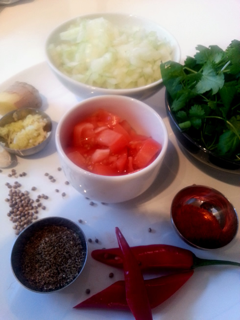 For å lage sausen varmer du oljen i en panne og har i cumin-frø et lite minutt, tilsett så den hakkede løken og en av de grønne chiliene som er delt i to. Stek til løken er gjennomsiktig, men ikke la den få farge.