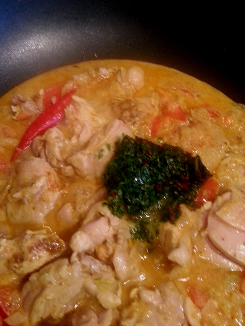 Mens kyllingen kokes lager du en pasta av korianderblandene og den andre grønne chilien. Dette kan du gjøre i en morter eller i en liten blender.